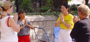 罗丝(Rose),一位来自俄亥俄州的中学教师,在联合广场向一群游人教授法轮功功法,其中一名妇女兴奋的说:“我找到了!我找到了!”这名激动的秘鲁妇女告诉罗丝她的一个梦。大约两个星期前的一天晚上,她梦到她的侄女告诉她自己病了,要炼五套功法。这位妇女百思不解,不明白这五套功法到底是什么?第二天,她打电话给侄女,发现侄女果然生病了,而且病得很重。她问侄女五套功法是什么意思,侄女说不知道。几天以后她来到了纽约,当她走在四十二大街时,一位法轮功学员递给她一份法轮功报纸,并用有限的英语说:“五套功法。” 这位妇女又惊又喜,惊的是世上真有奇迹出现,喜的是她终于找到了这个五套功法。