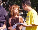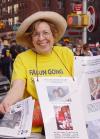 露西亚教授在分发法轮功真象报纸。