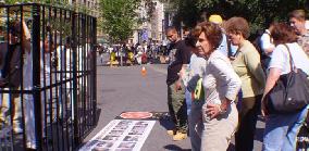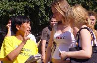 与其他团体的鼓噪形成鲜明对比的是法轮功学员的平和和理性,他们平静的向路人散发着介绍法轮功在中国被迫害故事的传单和报纸,并耐心的向每一位好奇或疑惑的询问者讲述中国法轮功学员被迫害的真象。而每一次的交谈都可以引出一个有趣而又动人的故事。