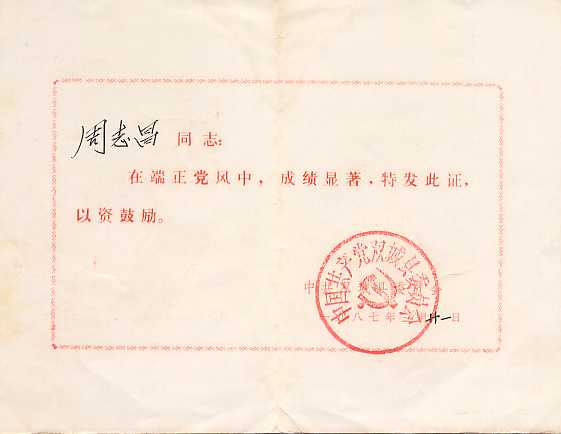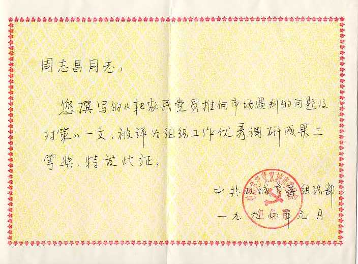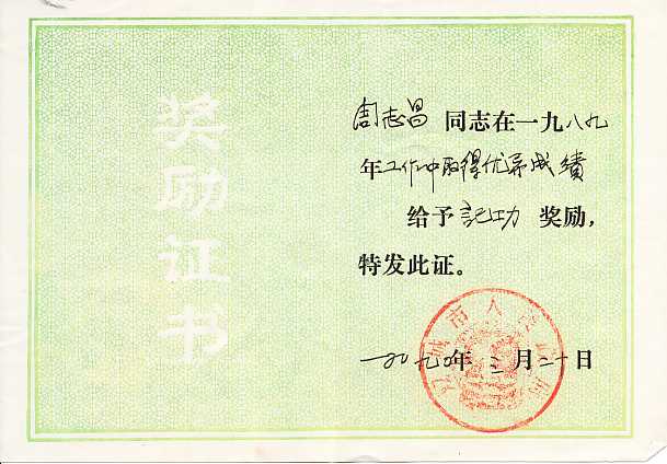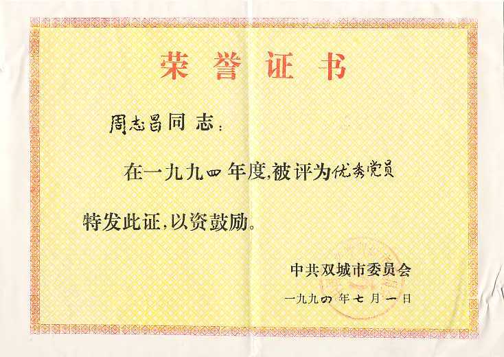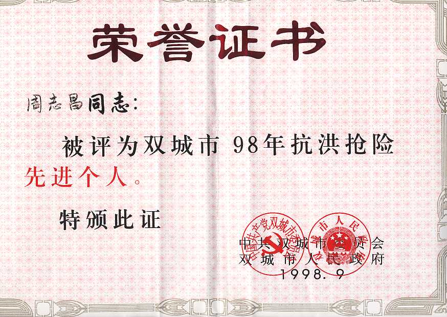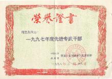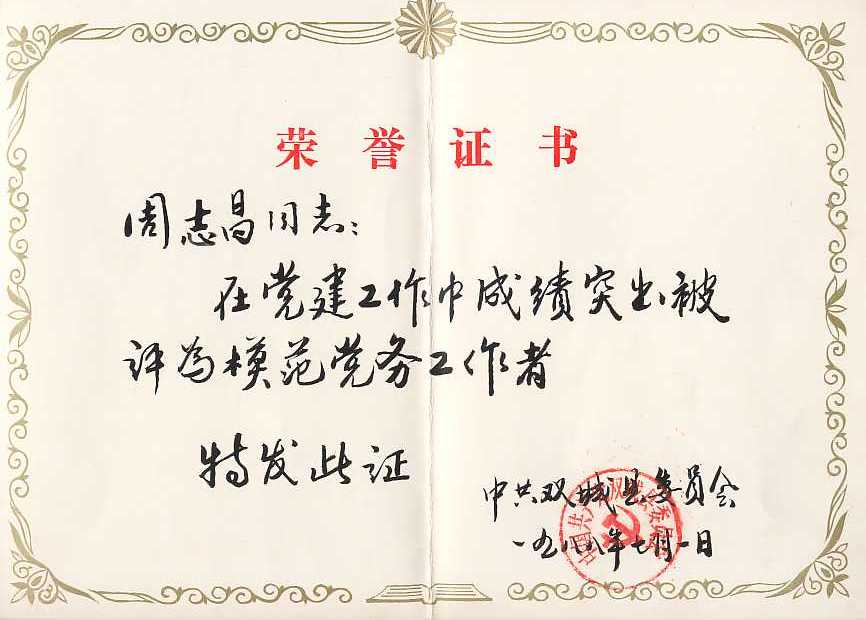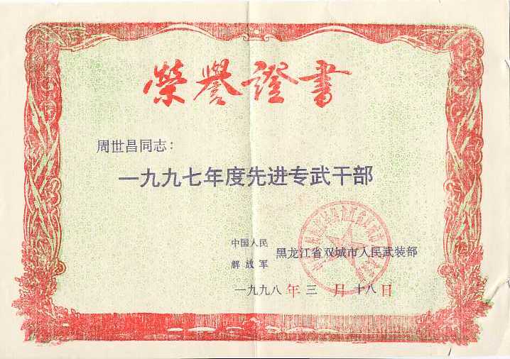 黑龙江双城市韩甸镇人武部部长周志昌从1995年9月份得法开始修炼法轮功,曾担任双城市法轮功辅导站负责人和韩甸镇法轮功辅导站的负责人。周志昌为政清廉,不谋私利,是韩甸镇远近闻名的好干部。提起周志昌,韩甸的老百姓都挑大拇指:“好人!”他在单位获得的各种荣誉证书有几十本。下面是大法弟子周志昌生前获得的部分荣誉证书。