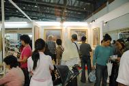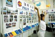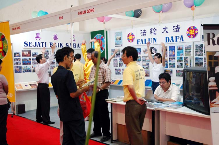 法轮大法书籍展是在A厅,“坚忍不屈的精神”画展设在B厅,两厅相串联。到了法轮大法书籍展位后,看到播放李老师亲自教功的炼功录像,又有炼功演示,很多人不禁纷纷表示愿意学炼,并要求就地教功。