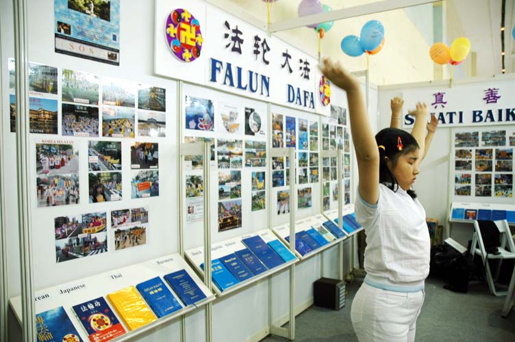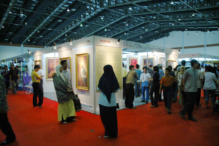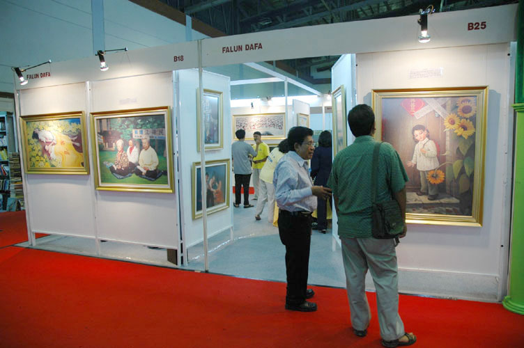 印尼法轮功协会参加了书展,在举办法轮大法书籍展的同时,也举办了“坚忍不屈的精神”艺术展,得到了热烈反响。