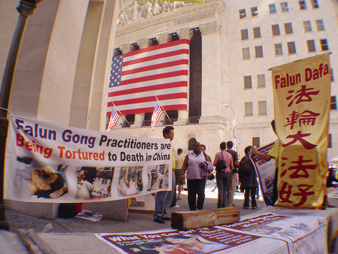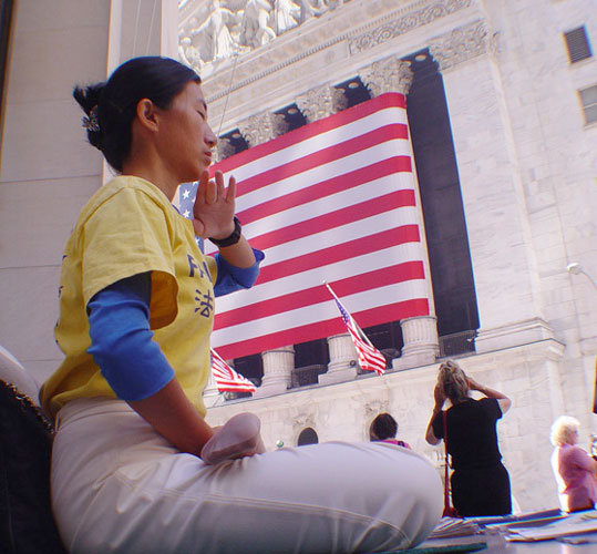 纽约股票交易所,这里的每一起落沉浮都牵动着世界的经济命脉,在当今恐怖分子威胁袭击的阴影下,中秋的华尔街11号更成了世界上最令人神经紧张的地点之一。然而就在戒备森严的交易所大楼对面却是一派祥和的景象,一群来自美国西海岸的法轮功学员平静的展示着法轮功的五套功法,并将法轮功无辜在中国被迫害的真象介绍给经过的每一位交易人、警察和路人。