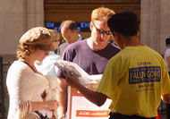 ![]() 学员向观众介绍法轮功、讲真象 | ![]() 功法展示 | ![]() 讲法轮功真象 |