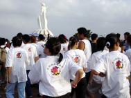 虽然二日晚上风很大,但观音亭仍陆续涌進了数千位澎湖民众。活动现场有各县市法轮大法学员们提供的多项节目:有发放气球,每位小朋友拿到气球后都高兴的念着说:“法轮大法好”;集体炼功配合讲真象看板、好书与澎湖乡亲分享;数千朵精美的纸制莲花赠与在场民众,这些美丽的莲花皆出自法轮功学员的手,以纯净的心做出来,难怪受到民众喜爱。