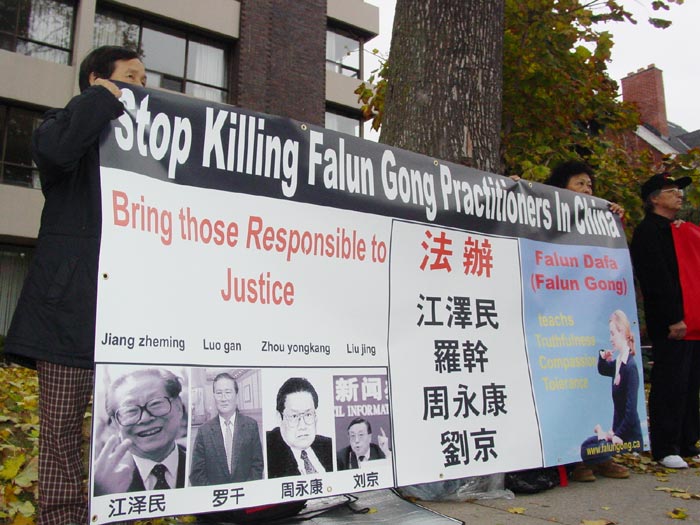 多伦多法轮大法发言人张照進先生在新闻发布会上宣读了声明,公布了迫害法轮功的几个元凶――江、罗、刘、周的主要罪行和法轮功学员将这些迫害法轮功的罪魁祸首绳之以法,伸张正义的决心。江××是这场这场长达5年、波及数亿人的迫害的直接发动者和指挥者,他出于妒嫉和对个人权力的保护,一意孤行发起了对法轮功的镇压,对数以千万计坚持信仰的中国法轮功学员实行“名誉上搞臭、经济上截断、肉体上消灭”,“打死白打、打死算自杀”、“不查身源、直接火化”的群体灭绝性政策。而罗干、刘京和周永康等人助纣为虐,积极策划、指使并在各地监督和推行了江氏发起的对法轮功的残酷迫害,双手同样沾满了无辜法轮功学员的鲜血,所以他们必须受到法律的严惩。
