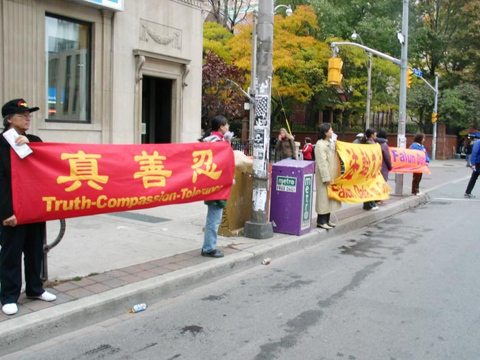 这时也有来自大陆的代表团正好路过此地,看到这么多法轮功学员走上街头公开呼吁停止镇压,与他们在国内看到的宣传大相径庭,都感到震惊,不少人好奇的接过学员递过去的资料,赶紧看起来,有的走出老远还在连连回头观望。看到这个情景,有几个学员追上前去,和他们一边走一边聊天,讲真象。学员告诉他们法轮功在世界上60多个国家都受到了欢迎和褒奖,在加拿大受到了包括加拿大总督,数百个议员和市长的公开支持和褒奖,只有在中国大陆江泽民出于妒忌心而一意孤行要镇压,其实它的所作所为根本不能代表中国政府,它和其它迫害元凶也必须为犯下的罪行而承担责任的。这些中国人静静的听着,若有所思。学员接着又告诉这些代表团成员,其实在国外有很多不同种族的人都修炼法轮功,而且他们认为法轮功代表着中国传统文化的精华,修炼后也非常热爱中国和中国的文化。其实法轮功根本就不参与政治,也不反对中国政府,相信在不久的将来,在中国法轮功也会受到欢迎和褒奖的。不少中国人听了忍不住点头。