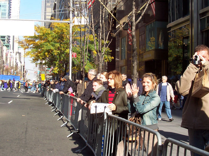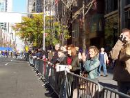 当天天气转暖,中午时分,太阳也露出了笑脸。老兵日游行是曼哈顿盛大游行之一,今年是第59届;有114个团体、约1万7千人参加;估计有超过10万的观众。游行队伍在曼哈顿著名的第五大道上行进。1百多位穿着黄色炼功服的法轮功学员在长长的队伍中格外显眼。