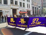走在前面的学员打着英文的“法轮大法”,以及中英文的“真善忍”的大横幅。跟着是用三朵金莲和彩花装饰的花车,六位中西方学员在上面演示法轮功五套功法。后面是法轮功学员表演的中国民间腰鼓。队伍经过时,很多观众急忙从口袋里拿出照相机拍照。有的观众鼓掌;有的不停挥动美国国旗;有的观众竖起表示“胜利”的手势。