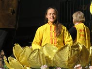 其中一位使劲鼓掌的西方女观众很开心的告诉记者,她以前没有听说过法轮大法。不知怎的,今天见到法轮大法的队伍时觉得很好;一种很舒服的、喜悦的感觉油然而生。