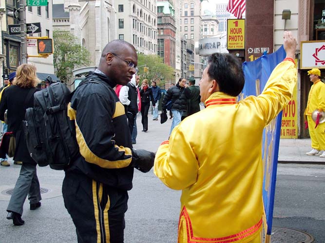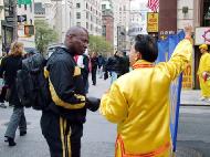 另一位西方男观众见到法轮功的队伍时,马上对着学员竖起了表示“胜利”的手势,直至队伍全部走过。他对记者说,在曼哈顿的很多大街都能看到法轮功学员在演示反酷刑展。很多纽约人因此了解了法轮大法,以及发生在中国的残酷迫害。