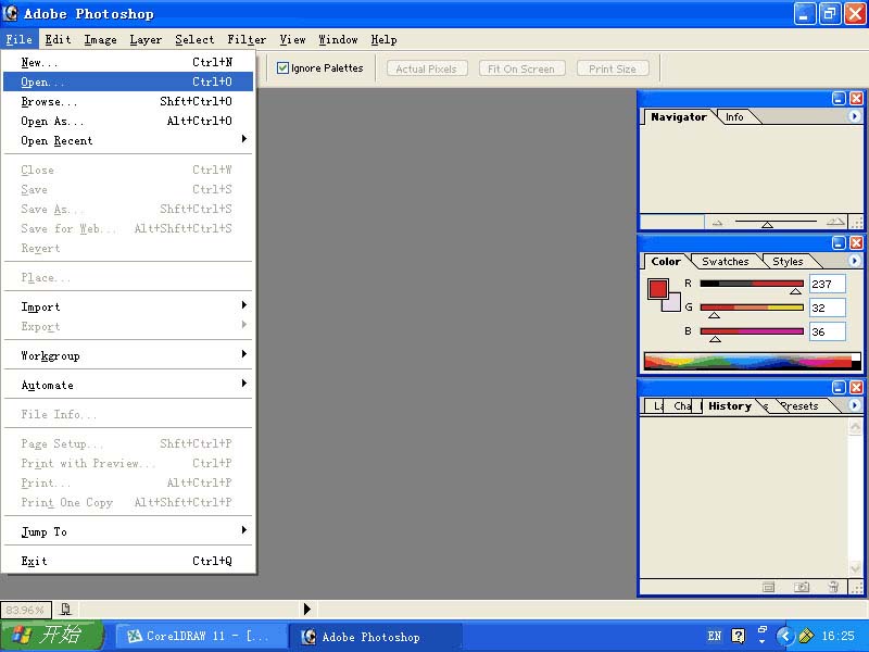 1、首先打开程序,执先File\Open…(文件\打开…)准备打开你要处理的图像。当然你双击工作窗口的空白处也行。如图(一)所示