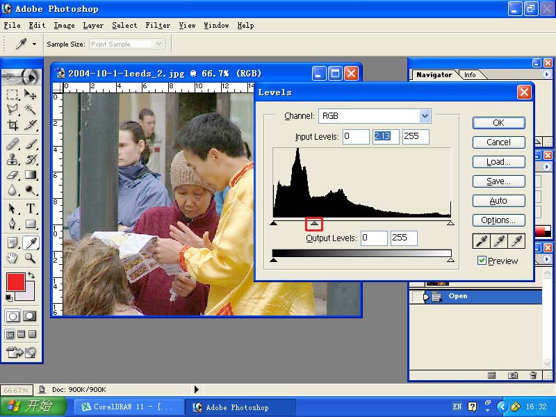 将红线框住的地方向左移动,边移动边观察图像色阶的变化,直至自己感觉满意为止,然后点击“OK”,如下图所示