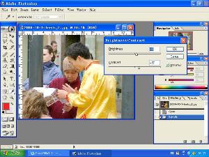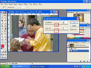 3、执行 Image\Adjustments\Brightness & Contrast…(图像\调整\亮度&对比度…)弹出对话框,如下图(六),图(七),图(八)所示,注意图(七)中红线框住的部份,在那里我们将在色阶中调得有点过蒙的图像進行清晰处理。