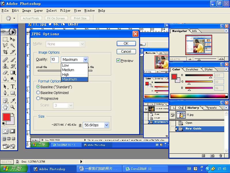 Maximum(最高质量):几乎不损失什么细节,质量几乎同原图一样,打印效果也很好,但前提是你处理前的原图片本身就有很高的分辨率。缺点:文件非常大。