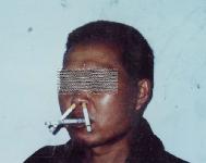 有一天,谢军等恶人把五只劣质香烟点燃,把两只插到到他的鼻孔内,另三只插在上下嘴唇之间(如图示),强迫他不断吸烟,烟不吸红就毒打。最后谢军等人眼睁睁看着烟头将大法弟子的嘴唇烧烂,嘴唇起满血泡泡,大法弟子被熏得头昏眼花,差点昏倒,赶紧靠墙站住。谢军还指使犯人抓住他的头朝墙上撞后脑部,大法弟子只觉得脑子一下象“损”了(轻微脑震荡)。