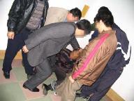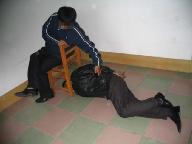 2000年7月26日,我在去天津街的路上被几个不明身份的人绑架到了吉林市公安局一处。有个姓孙的老头,他们说是处长,和几个恶警对我進行一番恐吓,看问不出什么就气急败坏的指使恶警用刑。恶警让人都出去,对我说:你不说,这回让你尝尝魔鬼的办法。他用椅子卡住我的头,猛抠软肋,剧痛难忍,使我几乎疼晕死过去。(图1)