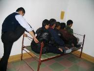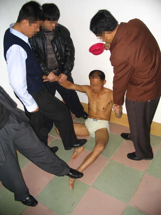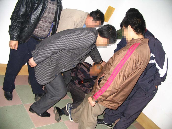 2001年2月6日,我被非法关進吉林市第一看守所001管区2号。十多平米的监室关着20多人,有好几个杀人犯已经成了变态狂,管教叫王仲让刑事犯叫我读诋毁大法的报纸;我不从,他们就打,然后把我扒光衣服抬進厕所,两大桶冰冷的凉水用小盆一点一点的浇在头芯上(图5),天气预报当天是零下42度。监室内水用光了,几个犯人把我象五马分尸一样,穿着鞋踩在脚上来回转,致使后来脚内侧溃疡,脚肿的象馒头。