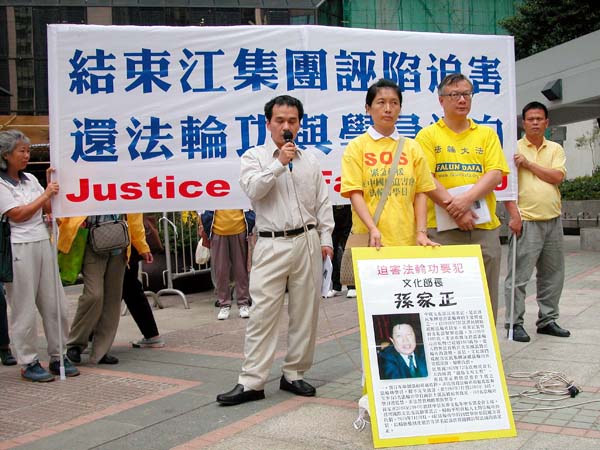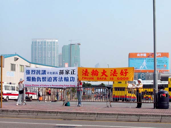 11月中旬,孙家正率领全国多个省市的文化厅长和局长,到香港参加“亚洲文化合作论坛2004”。11月14日清晨,两组法轮功学员分别在孙家正车队必经之路,和其出席活动的礼宾府正门,打出写着“法轮大法好”与“强烈抗议文化部长孙家正煽动仇恨迫害法轮功”的横幅,另一组数十学员则到礼宾府侧门发正念清除另外空间的邪恶。