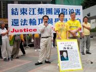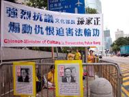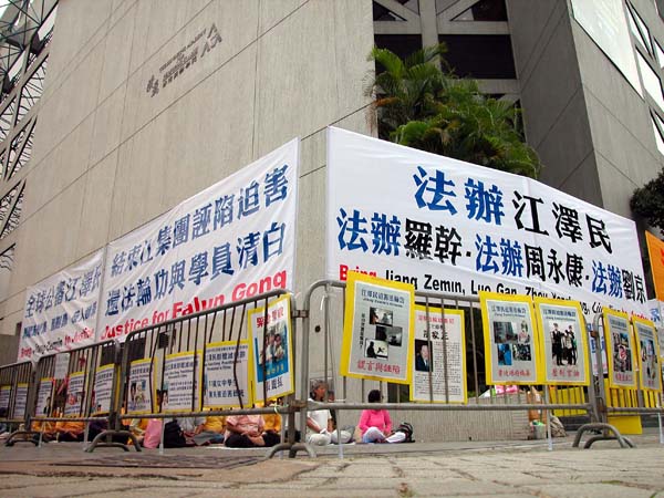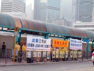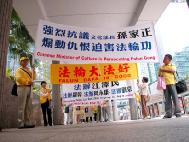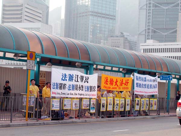 15日早晨,正值孙家正等人出席亚洲多国文化部长会议,几十名法轮功学员来到会议所在地的国际金融中心正门及侧门拉起横幅抗议和发正念,部分学员在附近繁忙的街道上发法轮功真象资料,让更多民众知道江集团和孙家正的罪行。