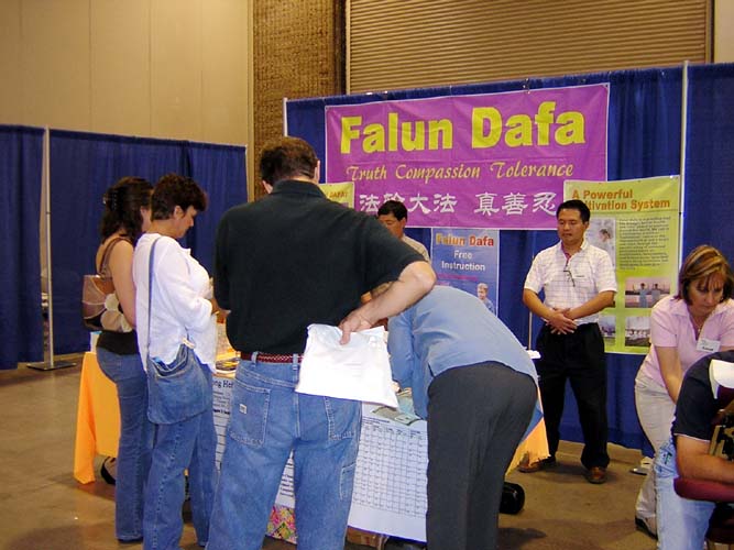许多来我们展位的人似乎很敏感。在教功过程中,一些人感到很兴奋,因为他们一开始学功就能感觉到能量。一位男子似乎被我们的展位所吸引,他站在那儿很长时间,一边和一位学员说话,一边观看学员们炼功。