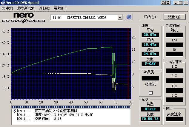 然后把刻录完后的光盘片放入光驱,直接在Nero CD-DVD Speed的主界面下点击“开始”按钮,进行测试(如下图)。