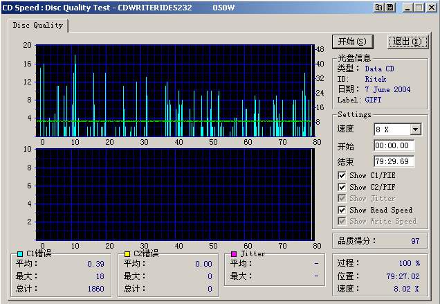 再就是检测速度,理论上,光盘的错误标准基本上是按1X速度时所制定的,也就是说,光盘只要能在1×的速度下达到相关的质量标准就被认为是合格的。光盘读取速度越高出现读取错误的几率也就越大,所以光驱读盘时当出现读取困难时都会自动降低读盘速度的。目前用自己的刻录机进行C1C2测试的人大多选用8×速进行。在我的刻录机上,我用8×检测这批光盘中质量不错的,在20×检测时C1C2值都很大,但是在VCD机和刻录机、华硕40×光驱上都能流畅清晰播放。因为我的刻录机最高读盘速度为52×,所以播放时会经常调整读取速度,而华硕40×光驱则以6×速起始读取并缓慢提高到16×速,全程稳定没有降速。我对此的理解是这些光盘能够满足低速读取的要求,高速读取时则会出现大量读取错误必须通过降速来读取。对于我们来说,因为刻出的盘主要是VCD,而VCD机的播放速度是低倍速,所以我认为用8×检测质量好即可,不需要高速检测有多么好的质量,当然如果高速检测的结果也不是很坏,那就是极品了。若使用4×进行检测,时间会加倍,而结果与8×检测接近。如果低速检测时出现了C2,那么这张盘的质量实在说不过去了。