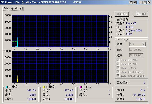 用16×刻出的盘在检测到4分半时就进行不下去了,而且C1最大值达到9356,出现C2错误,最大值为11638,说明刻废了,用VCD机检验,到4分左右开始出现大量马赛克,然后读不动了。