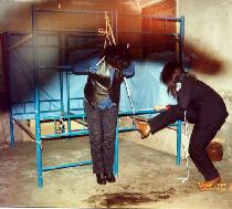 【明慧网2004年11月19日】 2001年1月3日晚,我在哈尔滨铁路收容所绝食抗议非法关押迫害的第六天,被野蛮灌食,绝食的第七天傍晚被送到哈尔滨市收容遣送站,地点是哈市道外区长春街19号。一自称是哈尔滨市公安局的唐科长,指挥鸡西(全省各地抽调的)警察将我双臂拧到背后,用一根铅笔粗细的白色绳子,从脖子后到前面,经腋下到背后,将双手死死的勒紧,与脖后绳连在一起,双脚离地吊在门框上。(图片1)
