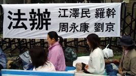 2004年11月19日上午,日本近畿法轮功学员前往大阪中国总领事馆,要求法办迫害法轮功的元凶江泽民及其主要帮凶罗干、刘京和周永康。