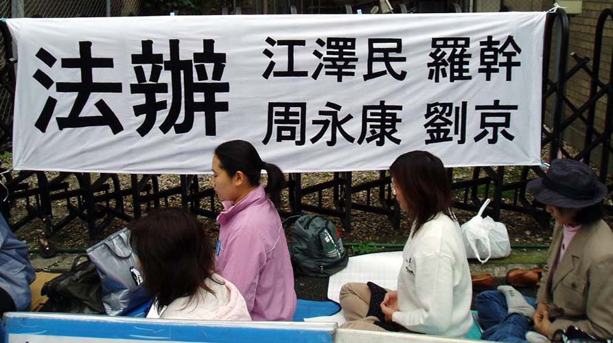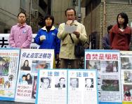 日本学员大阪中领馆前呼吁法办江罗刘周(图)