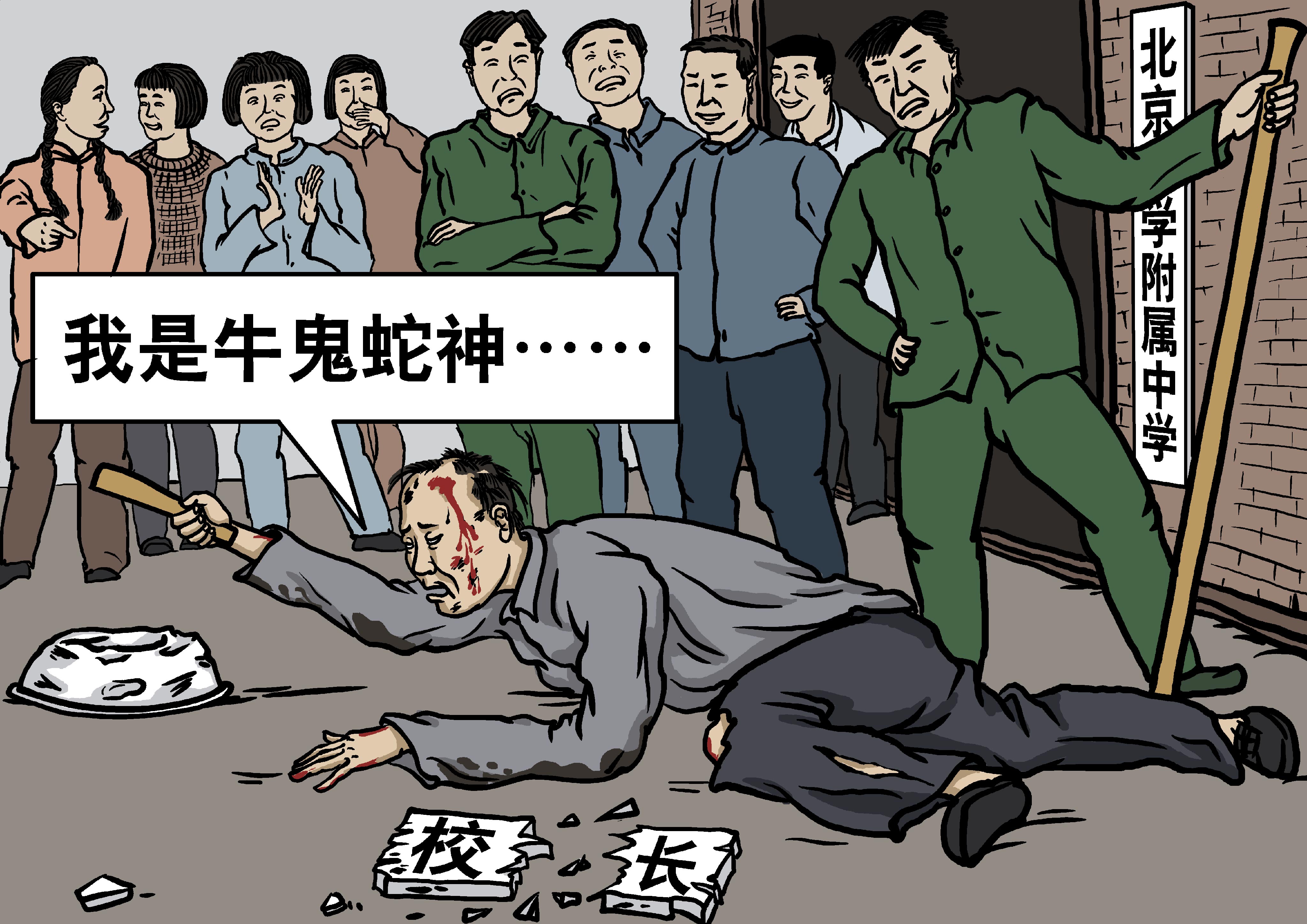 古人云:“一日为师,终生为父”。1966年8月5日,北京师范大学女子附属中学卞仲耘老师被女学生们戴高帽子、往身上泼黑墨、敲簸箕游街、挂黑牌子、强迫下跪、用带钉子的木棍打、用开水烫等等方法活活打死。北京大学附属中学的女校长被学生强迫敲着一个破脸盆喊“我是牛鬼蛇神”,头发乱七八糟被剪光,头打出了血,推倒在地上爬。