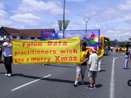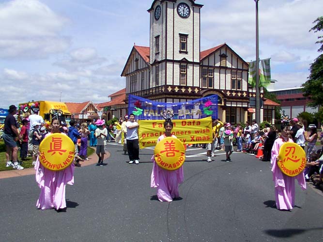 【明慧网2004年11月22日】圣诞节即将到来,新西兰各个城市也陆续展开圣诞游行活动,2004年11月20日,新西兰法轮功学员首先参加了罗陀如阿(Rotorua)一年一度的圣诞游行。“仙女”、彩车和腰鼓队,富有中国传统文化色彩。游行途中,当地居民以掌声表达对法轮功学员游行队伍的欢迎。很多的围观群众看着前导“仙女”手上的牌子,念着真、善、忍。