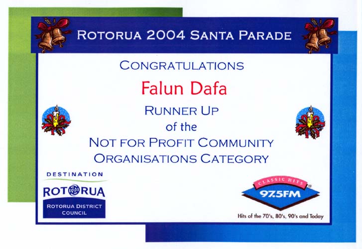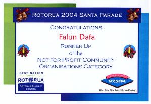 圣诞游行后,当地市政府社区服务官员(Community Service Officer)汤姆贝克先生(Mr. Tom Baker)来函寄上圣诞游行非盈利社团组织类二等奖奖状,信中表示恭贺并祝法轮功学员圣诞及新年快乐。