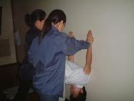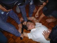 图2:受害人演示天津红桥区看守所对法轮功学员的野蛮灌食