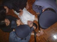第一次,2000年1月25日,早上5:30在劳教所操场上我们被强迫走队时,我坐下来打坐炼功,因为我想劳教所没有权力强制我们,不让我们炼功,我们没有犯罪。