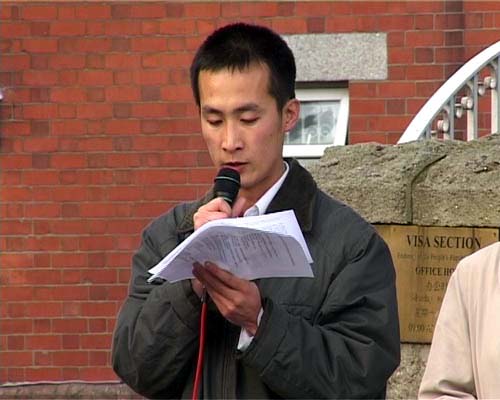 初冬时节的爱尔兰,疾风飒飒。法轮功学员们在寒风中打出了“法办江泽民”和“法办罗干、刘京、周永康”和“支持停止在中国对法轮功的迫害”中英文的横幅,新闻发布会发言人赵明先生宣读了追查迫害法轮功国际组织的公告。宣告了江罗刘周四人在迫害法轮功中的罪行。