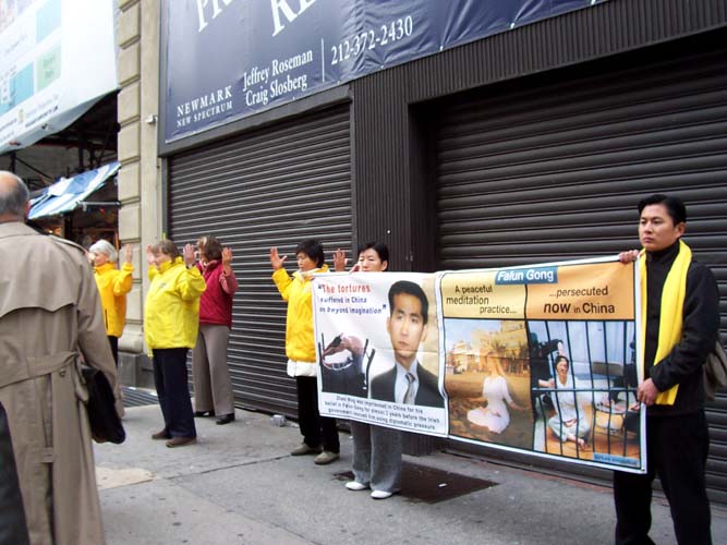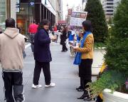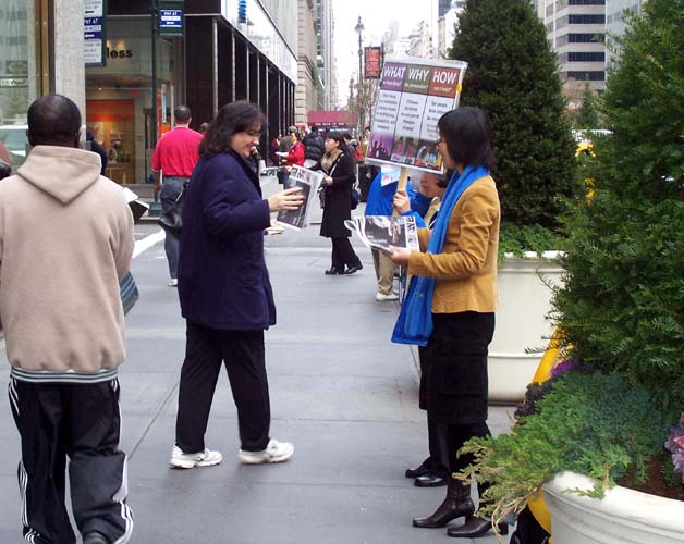 邹伟说,我在华尔街发真象资料的时候,碰到一位白领的西方人士,他说法轮功是他在纽约见到的最持久的一个团体。他说,“今天早上,我在公园大道发资料的时候,一位美国人把星期一的纽约时报递过来,上面刊登了法轮功学员在曼哈顿讲真象的报道,他说他已经看了介绍法轮功的文章,并把报纸给了我。”