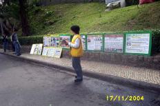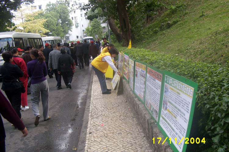 近一个时期来,由于旧的讲真象地点前面進行建筑施工,来澳的游客改道而行,因此法轮功学员们将讲真象的地方换到了著名景点大三巴,这里也是访澳游客的必经之地。由于地段不同,这里属于澳门第一区警司处的管辖范围。该警司处两个多月来一天不落的天天都派便衣警察来照相,并派专门的警察站在附近進行监视。学员们善意耐心的面对面向他们讲真象,给他们许多的真象资料让他们带回去给他们的上司和同事看,一些警察明白真象后都表示理解和同情,但又无奈的表示他们只是执行上面的命令,不想做也不行。然而该警区的主管官员却是紧紧追随江氏集团的迫害政策。