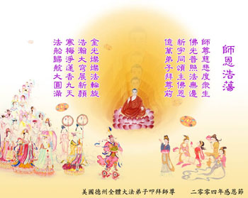 有一次,我看见师父在美国一个地方讲法时,恶警坐飞机去破坏,它们找美国却不见美国,找到美国时却不见师父讲法的那幢楼,后来它们发现师父讲法的地方是一条宽大的河,只要邪恶靠近河,河就发出耀眼的光逼退了它们。