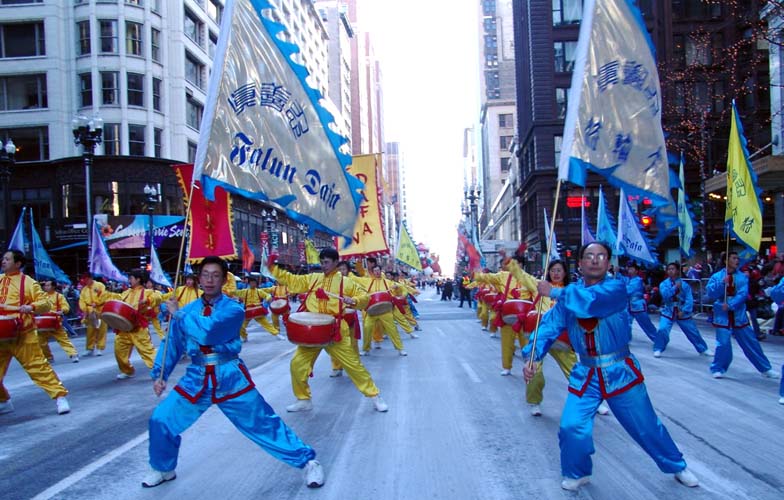 游行开始后,由身着天蓝色的舞旗手和身着金黄色的唐鼓手组成的“威风旗鼓阵”走在印有“法轮大法”“真善忍”的巨大横匾后面,两面印有中英文字样的“法轮大法”的旌旗在方阵中高高矗立着,舞旗手手持印有“法轮大法”的九色彩旗,和唐鼓手巧妙的结合在一起,或变化队形,或亮出整齐的姿势, 这也是法轮功学员们在游行当中第一次使用的形式。学员们精彩的表演立即引起了数十万现场观众的热烈掌声和欢呼声,许多华人也是拿起了照相机,摄像机,记录下这个美好时刻。