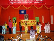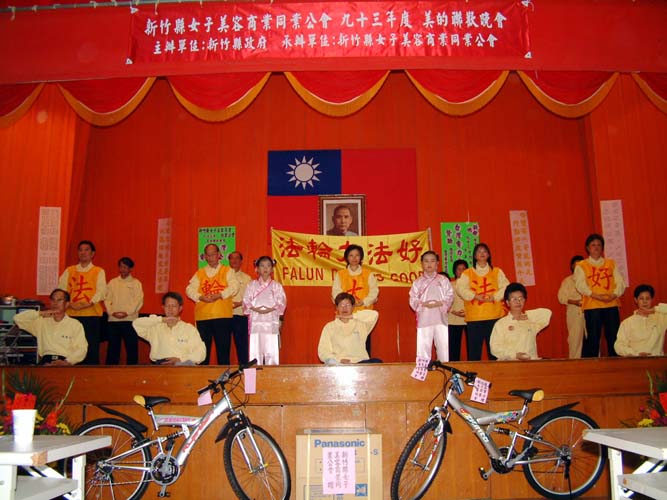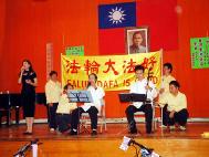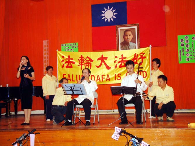 【明慧网2004年11月26日】2004年11月20日,台湾新竹县美容商业同业公会举办一年一度的联欢活动,法轮功学员受邀参与盛会。为把法轮功的美好带给现场的民众,法轮功学员们准备了功法表演及音乐表演,这其中也包括10位法轮功小弟子的音乐表演,过程庄严而祥和。