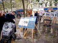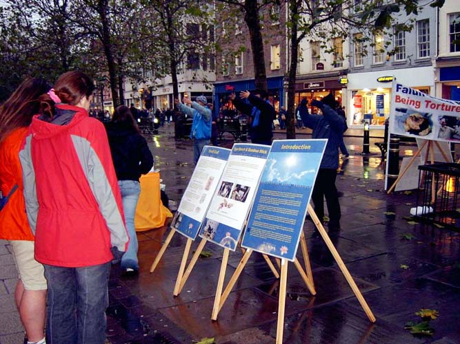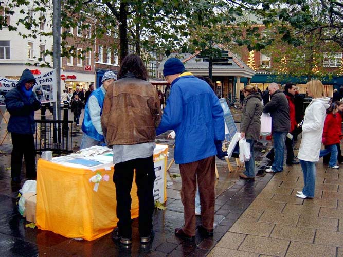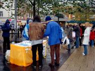 天一直阴着,学员们很快在市中心支起了征签用的桌子,撑起了说明中共江氏集团如何以酷刑迫害法轮功学员的展板,挂上了醒目的横幅。然后一些学员炼功,一些开始在街头发传单和征签。征签的内容是将迫害法轮功的元凶江泽民送上法庭和营救亲人。