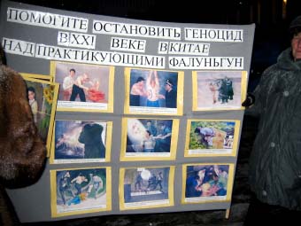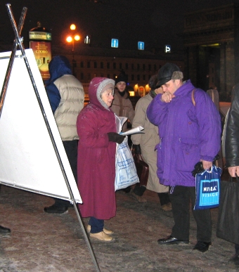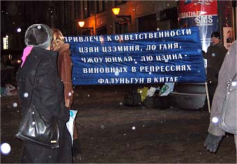 【明慧网2004年11月27日】11月25日是妇女反暴力行为国际日。这一天,俄罗斯圣彼得堡的法轮功学员们在市中心的涅瓦大街,著名的喀山大教堂对面,举行了反对正发生在中国的对修炼法轮功的妇女進行酷刑折磨和侮辱的抗议活动。举行这个抗议活动的地点,早已成了传统的圣彼得堡学员向当地市民洪扬法轮大法、公开讲真象的地方。学员们在举行抗议活动的前一天向当地媒体部门讲真象,说明此次活动的目地。由于讲清真象的结果,这次活动很顺利的得到了当地政府机关的许可。