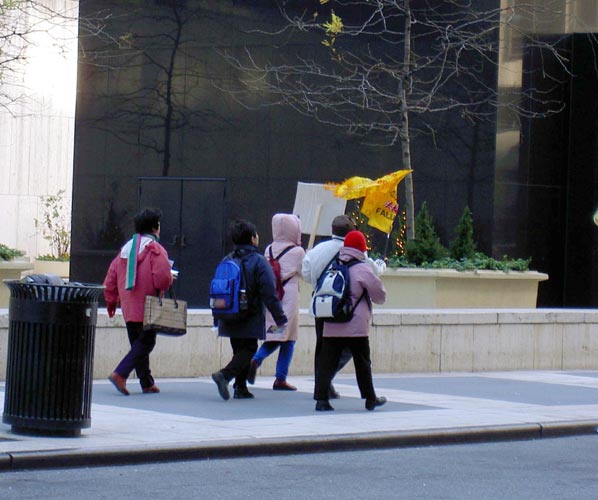 站在街头,我思考着,纽约客会怎么想我们这些法轮功学员?干嘛要来到地铁?如果他们每天都遇到我们,然后每天都要说一声:“我拿过了”,会不会觉得很厌烦?他们会不会觉得我们揭露真象是在“让中国颜面无光”?