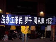 法轮功学员沙泉表示,我们今晚在此烛光守夜,是向中领馆里的中国官员发出强烈和明确的信息,立即停止迫害法轮功;同时告诉他们,江氏集团血债累累,我们一定要把它们绳之以法。沙泉说:“目前为止已经证实有至少1千1百多位法轮功学员被迫害致死,成千上万的法轮功学员遭到残酷折磨,家庭因此而破碎,被迫流离失所,生活无着落。迫害者犯下了群体灭绝罪和反人类罪,是一定要受到法律的制裁,以及历史和良心道义的审判。”