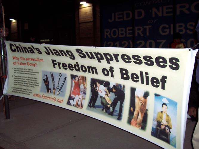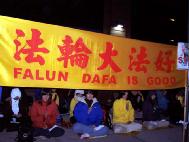 横幅表达了法轮功学员的心声