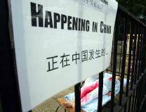 展,酷刑展前的牌子上写着:“酷刑正在中国发生;法轮功学员因信仰真善忍在中国受到的酷刑。”