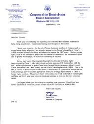 他说,由于中华人民共和国与美国進行大量的贸易交易,我认为美国政府应该利用我们的贸易优势和其他适当的途径促進中国改善人权。请相信我将一如既往的在中国人权方面尽我的责任,同时我也会参考您的意见,继续为停止迫害法轮功学员而努力。