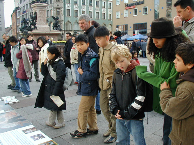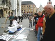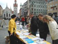 【明慧网2004年11月9日】2004年11月6日,来自德国帕索(Passau)、累根斯堡(Regensburg)和慕尼黑(Muenchen)的法轮功学员聚集在慕尼黑玛琳广场(Marienplatz),举行了包括功法表演、信息咨询、图片展出和模拟酷刑在内的系列活动。国际人权组织(IGFM)缇拉克先生(Thierack)以及不久前从国内被营救回来的柏林法轮功学员熊伟也参加了活动。